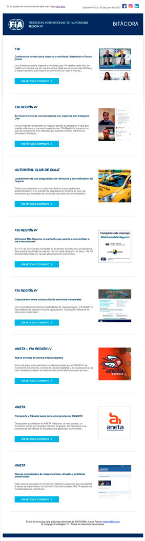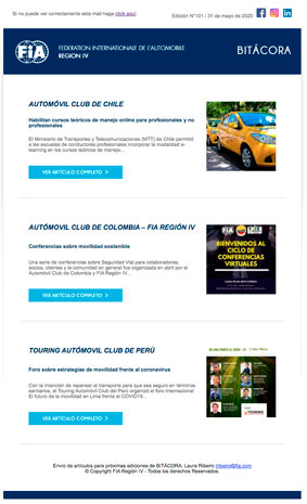 Con el propósito de concientizar a la sociedad sobre la importancia de la seguridad en la movilidad, FIA Región IV desarrolla, principalmente en fechas especiales, iniciativas y piezas de comunicación para compartir con todos los Clubes miembros y alentar su difusión.
