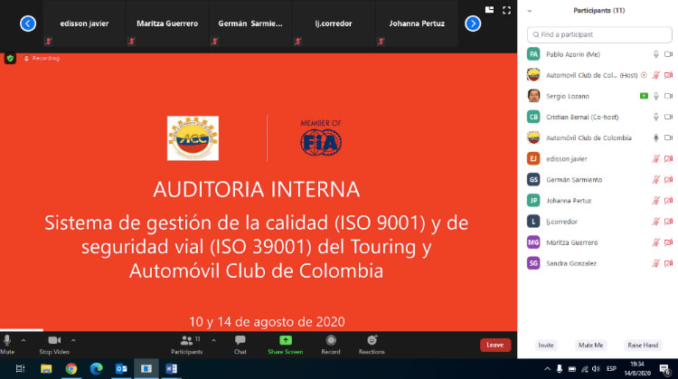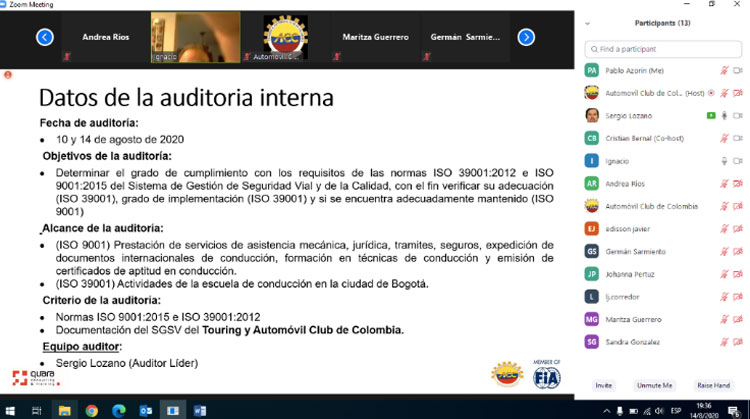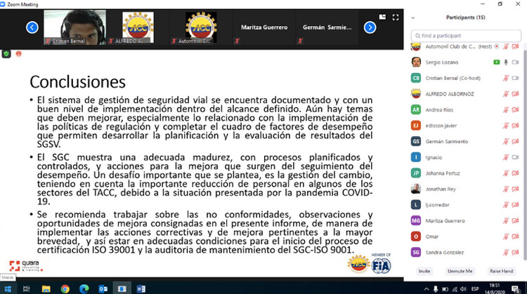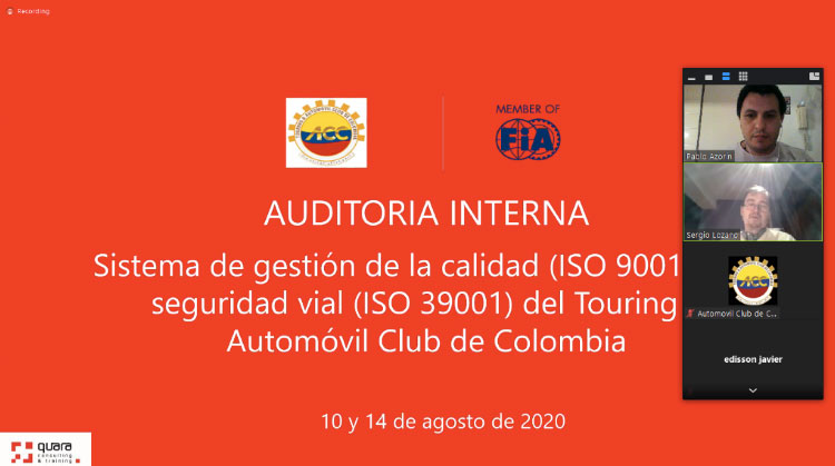 Con el apoyo de FIA Región IV, el Touring y Automóvil Club de Colombia (TACC) fue auditado de manera virtual por el ingeniero de la consultora Quara Group, Sergio Lozano, los días 10 y 14 de agosto. El propósito consistía en analizar el grado de cumplimiento de las normas ISO 39001 e ISO 9001.