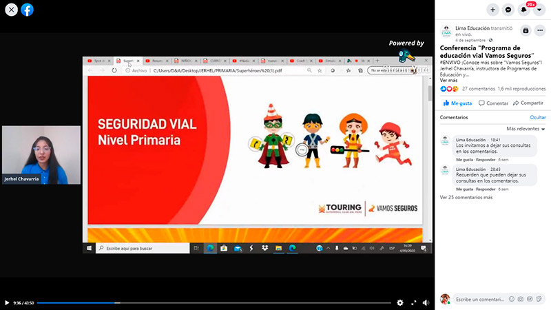 La segunda instancia de exposición consistió en la presentación de los contenidos actualizados del programa de educación vial “Vamos Seguros” el cual cuenta, para los alumnos de primaria, con los “Súper héroes de la Seguridad Vial”, una iniciativa que busca concientizarlos sobre las buenas prácticas en la vía pública. Para los chicos de Secundario, por su parte, el programa se enfoca en la prevención de accidentes por consumo de alcohol, en conceptos de movilidad sostenible y en el uso responsable y adecuado de bicicletas y scooters. Fue Jerhel Chavarría, la responsable de programas educativos del Touring y Automóvil Club del Perú, quien estuvo al frente de la conferencia, la cual se halla disponible en https://www.facebook.com/EducacionMML/videos/programa-de-educaci%C3%B3n-vial-vamos-seguros/2705257793085408/.