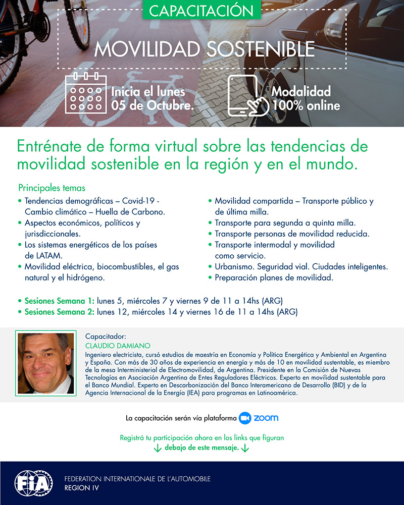 En una nueva iniciativa tendiente a colaborar en la formación de expertos y técnicos de los Clubes de automóvil de Latinoamérica, FIA Región IV organizó un seminario sobre Movilidad Sostenible que se llevó adelante entre el 5 al 16 de octubre, de manera virtual.