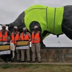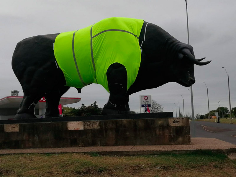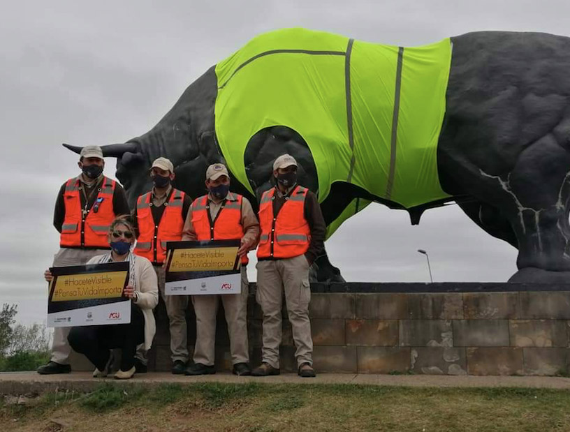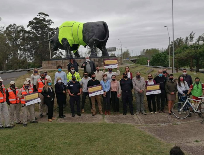 Una de las más visibles consistió en vestir a la emblemática escultura del toro que representa a la ciudad uruguaya, con un chaleco reflectante. La intención fue promover el uso de indumentaria reflectante en el tránsito. Por eso también se informó a los ciclistas y motociclistas acerca del papel fundamental que cumplen estos elementos en materia de prevención. Fue en esa misma plazoleta en la que se ubica el