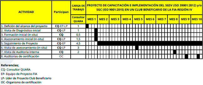 El programa de FIA Región IV de apoyo a los Clubes se inició con la formación de Auditores Lideres de la norma cumplimentado con la fase actual de asesoramiento y actividades de implementación de Sistemas de Gestión de Seguridad Vial y de Sistemas de Gestión de la Calidad en el Club.
