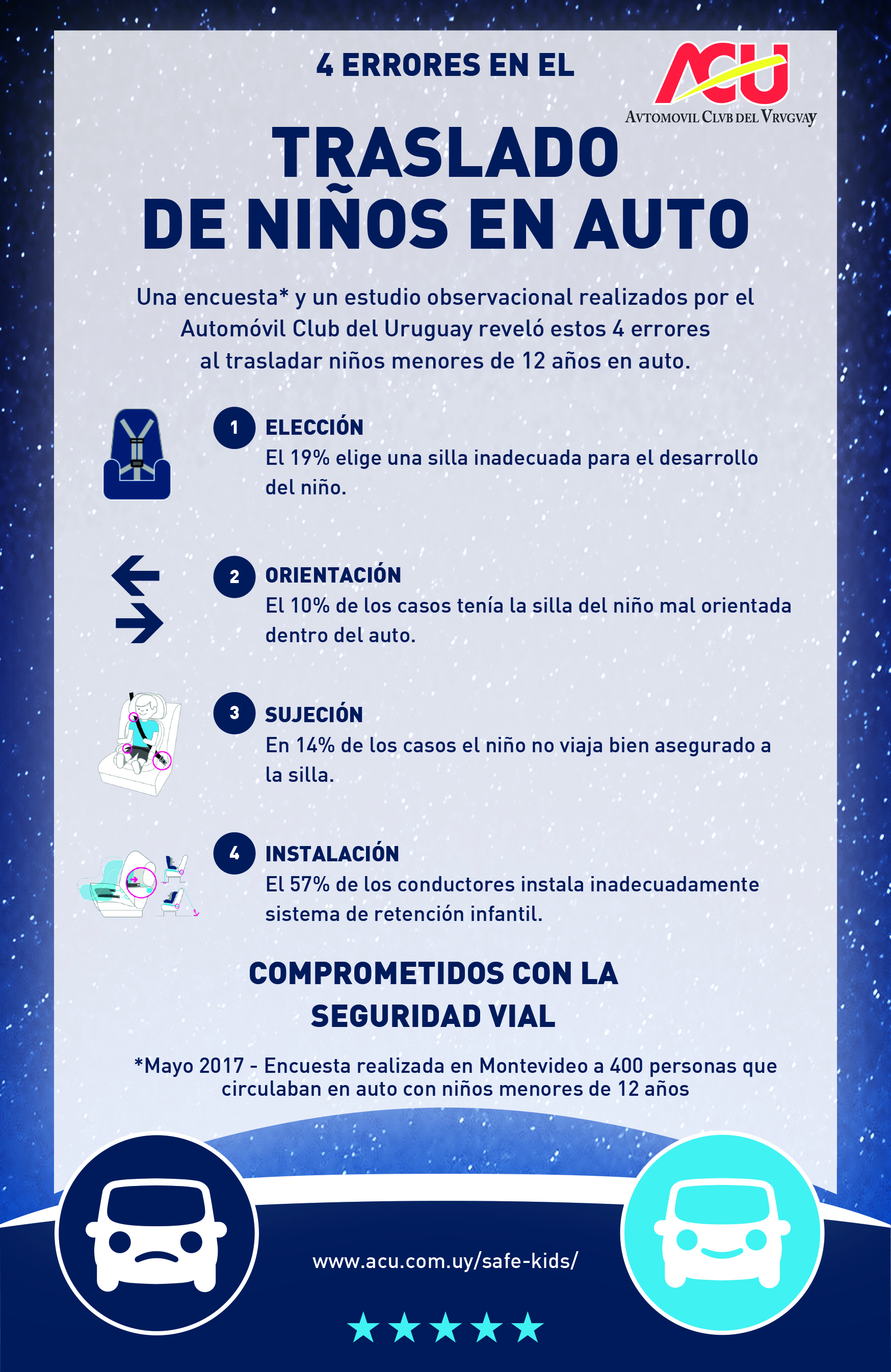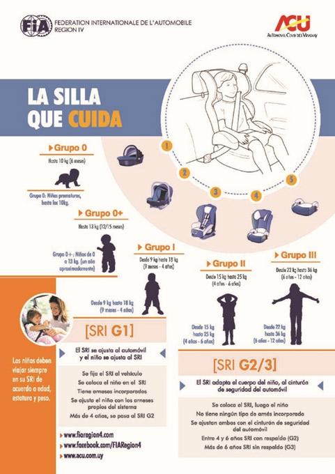 A principio de Agosto técnicos certificados por Safe Kids Worldwide del Automóvil Club del Uruguay (ACU) y FIA Región IV asesoraron y aconsejaron a padres y abuelos sobre la importancia del uso de sistemas de retención infantil como así también sobre su correcta instalación. Una estudio realizado por observadores del Automóvil Club del Uruguay (ACU) a más de 400 personas que circulaban en automóvil con niños menores de 12 años, reveló que un 57% de los casos presentaba errores en la instalación adecuada del sistema de retención infantil. Las demás equivocaciones principales que se registraron entre quienes trasladaban niños menores fueron: