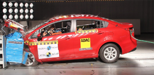 El Kia Rio Sedán, fabricado en Corea, fue también una desilusión con cero estrellas en la protección del pasajero adulto y una estrella para ocupante infantil. Sin embargo, el auto ofrece una estructura estable en la colisión frontal y un buen desarrollo estructural para el impacto lateral. El fabricante ofrece el Rio Sedan sin bolsas de aire y sin frenos ABS en su versión básica. La falta de bolsas de aire y de cinturones de seguridad con buen desempeño explican los pobres resultados para la cabeza y pecho de los pasajeros delanteros.