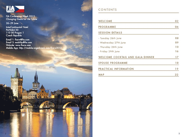 Luego del éxito de la Conference Week FIA 2011 , en la cual asistieron más de 180 delegados de Automóviles Clubes reunidos en más de 60 países, este año nos estamos preparando para la Conference Week FIA 2012 , que tendrá lugar en la histórica ciudad de Praga, el próximo 26 al 29 de Junio.