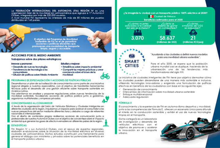 Por ello, FIA Región IV junto a sus Automóvil Clubes buscan acompañar a las ciudades y crear conciencia sobre la importancia de repensar el futuro de la movilidad en Latinoamérica. El programa se basa en tres ejes, por un lado generar el conocimiento y la especialización en materia de movilidad sostenible, por otro lado impulsar acciones de políticas públicas con el objetivo de promover regulaciones que incentiven un transporte limpio, y por último concientizar al consumidor sobre el impacto que producen las emisiones de contaminantes en el medio ambiente.
