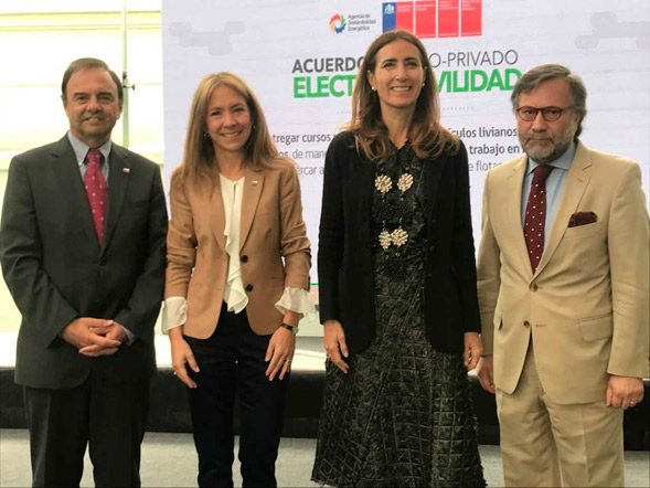Las Ministras de Energía, Susana Jiménez, y del Medio Ambiente, Carolina Schmidt, junto al subsecretario de Transportes, José Luis Domínguez, y el vicepresidente ejecutivo de CORFO, Sebastián Sichel, encabezaron la ceremonia en que se firmó un nuevo compromiso público–privado con 38 empresas e instituciones para promover la electromovilidad en el país.