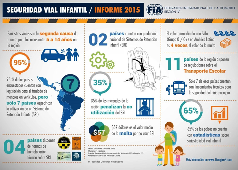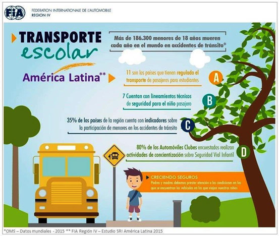 Asimismo dicho estudio describe que para el resto de Latinoamérica, sólo 11 países disponen de regulaciones sobre el transporte escolar y cuentan con escasos lineamientos técnicos para la seguridad del niño pasajero, entre otros.