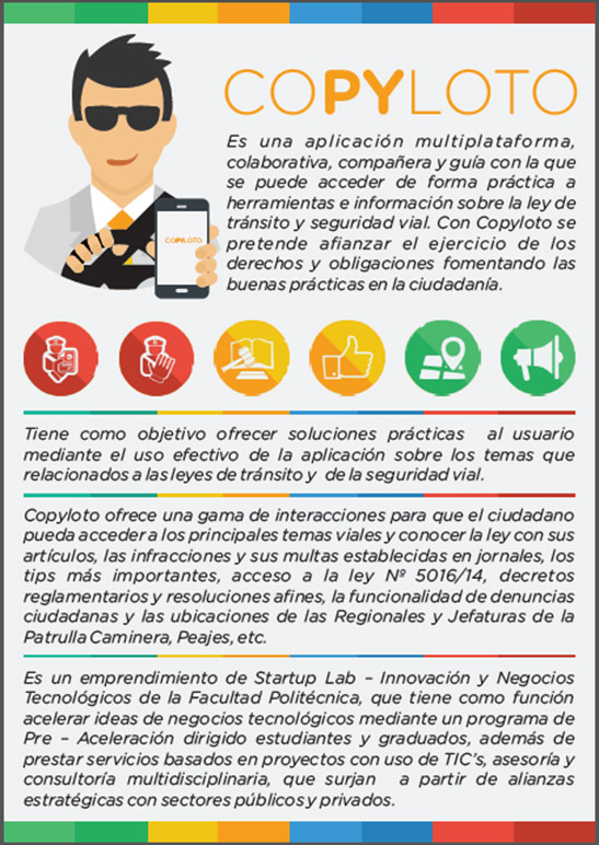 El Touring y Automóvil Club Paraguayo (TACPy) la Facultad Politécnica de la Universidad Nacional de Asunción firmaron un convenio de cooperación a través del cual el Club se adhiere al equipo de jóvenes desarrolladores de la aplicación móvil “Copyloto” para fomentar el uso de la plataforma, cuyo objetivo es ofrecer soluciones prácticas al usuario sobre los temas relacionados a las leyes de tránsito y de la seguridad vial.