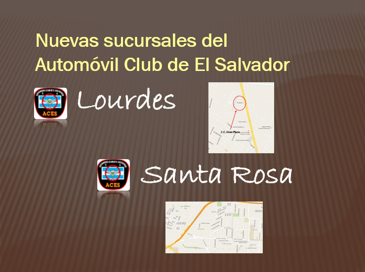 El Automóvil Club de El Salvador (ACES) se complace en notificar la apertura de dos sucursales muy importantes, ubicadas una de ellas en Lourdes, Colon, y la mas reciente en Santa Tecla, Centro Comercial Santa Rosa.