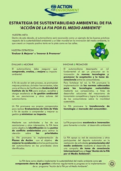 Uno de los objetivos de FIA, es generar iniciativas para que el deporte automotor y la movilidad sean reconocidos como un ejemplo de las mejores prácticas en sustentabilidad ambiental a través de la innovación dirigida a crear un impacto positivo tanto en la pista de carreras como en las vías de circulación.
