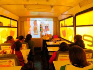 Los niños reciben la clase teórica en el bus escuela de manera amigable y lúdica mientras que en el circuito reciben la clase práctica donde son capacitados en interpretación y cumplimiento de las señales de tránsito, asumiendo los roles de conductor y peatón.