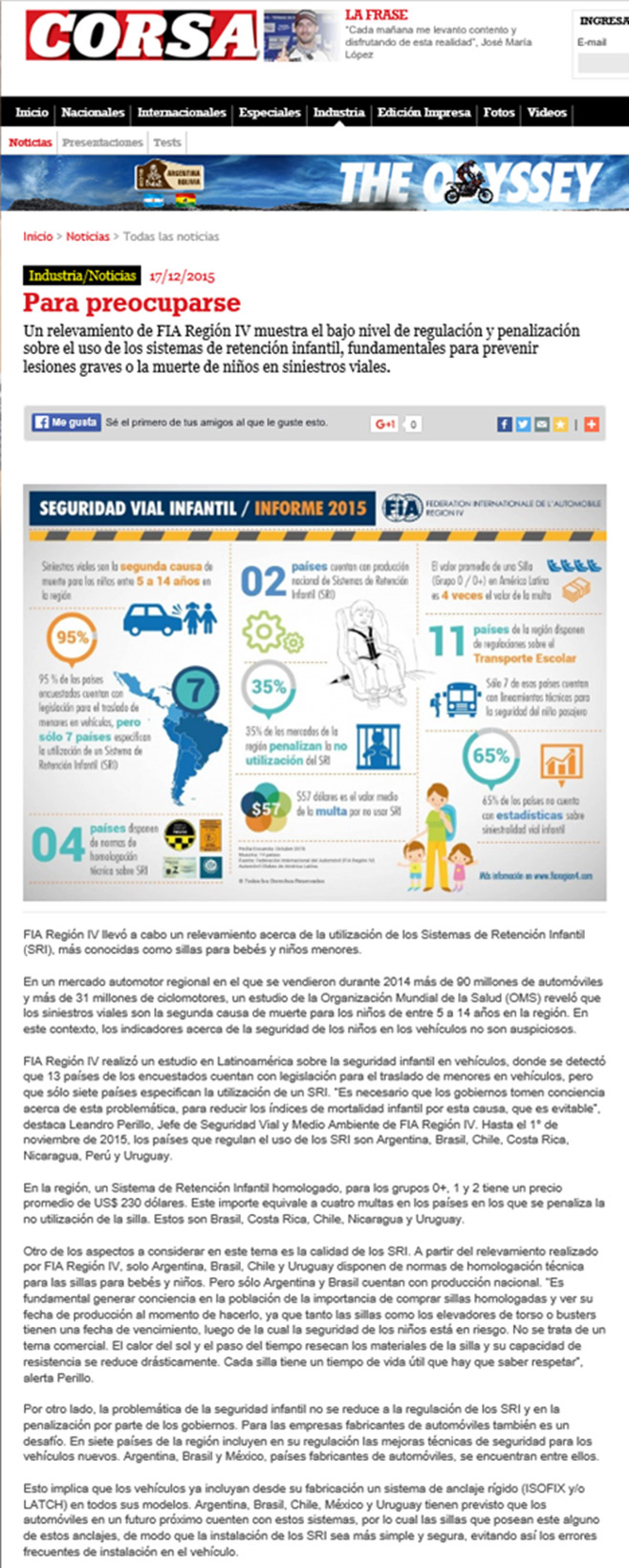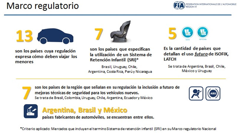 El estudio arrojó datos preocupantes respecto a la adecuada legislación que es necesaria implementar en muchos de los países de Latinoamerica como asi tambien el poco conocimiento de la sociedad en términos del uso adecuado de las sillas de retención infantil (SRI), su homologación y correcta instalación de la misma., fundamentales para prevenir lesiones graves o la muerte de niños en siniestros viales.